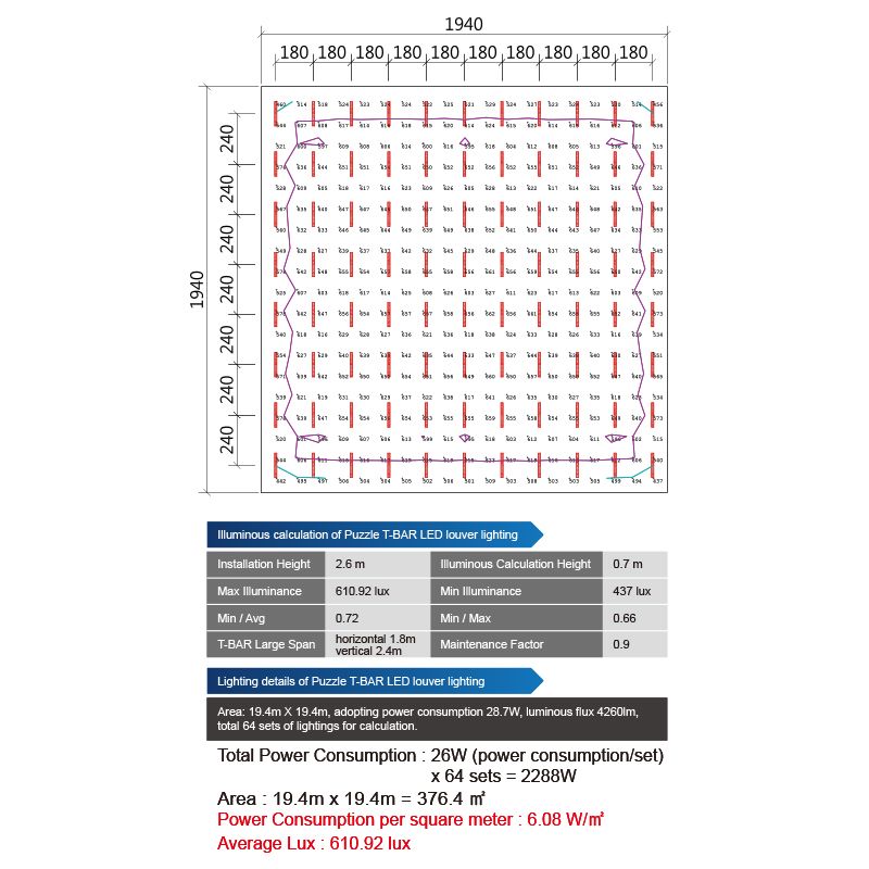 Terület: 19,4 m X 19,4 m, 26 W energiafogyasztás, 2670 lm fényáram, összesen 88 lámpatest a számításhoz: