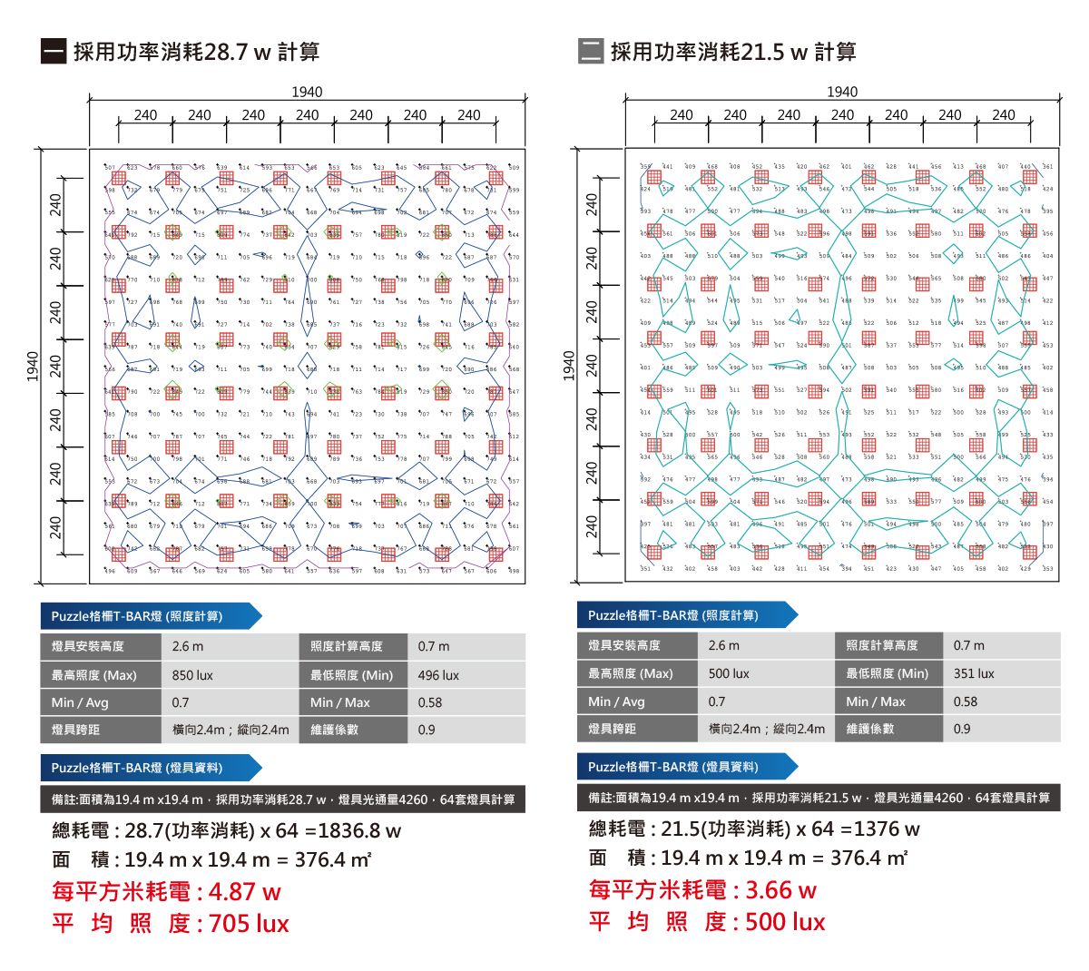 Puzzle 系列高效率低眩光格柵天花板燈具是一款完美方形辦公室節能照明燈具,通過超高效(155lm/w)、卓越的低眩光照明(UGR<16)和低功率消耗,以創造更大綜效。以下是我們使用 64 套Puzzle 系列超高效低眩光格柵天花板燈具,分別以21.5W及28.7W功率消耗,在 19.4m x 19.4m區域內進行照度計算的 2 種範例。